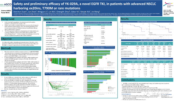 摘要標題:YK-029A,一種新EGFR酪氨酸激酶抑制劑,在攜帶EGFR ex20ins、T790M或罕見突變的晚期非小細胞肺癌患者中的安全性和初步療效。Safety and preliminary efficacy of YK-029A, a novel EGFR TKI, in patients with advanced NSCLC harboring ex20ins, T790M or rare mutations.