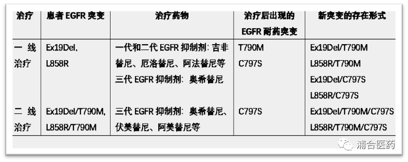 在非小細胞肺癌中,10-50%的患者具有EGFR激活性突變(亞洲:49.1%;歐洲:12.8%)。其中,常見EGFR激活性突變19外顯子缺失(Ex19del)和21外顯子的L858R突變對于一代和二代EGFR抑制劑吉非替尼、厄洛替尼、阿法替尼等具有敏感性,可以使用這些抑制劑進行治療,但在治療后患者經常出現新的突變即T790M突變,導致患者對這些藥物出現耐藥性,進而導致疾病進展。雖然三代EGFR抑制劑奧希替尼可以強效抑制T790M突變,但在奧希替尼用藥后有10-24%的患者出現了C797S耐藥突變,臨床急需可克服C797S突變的四代EGFR抑制劑的研發。具體見下表。